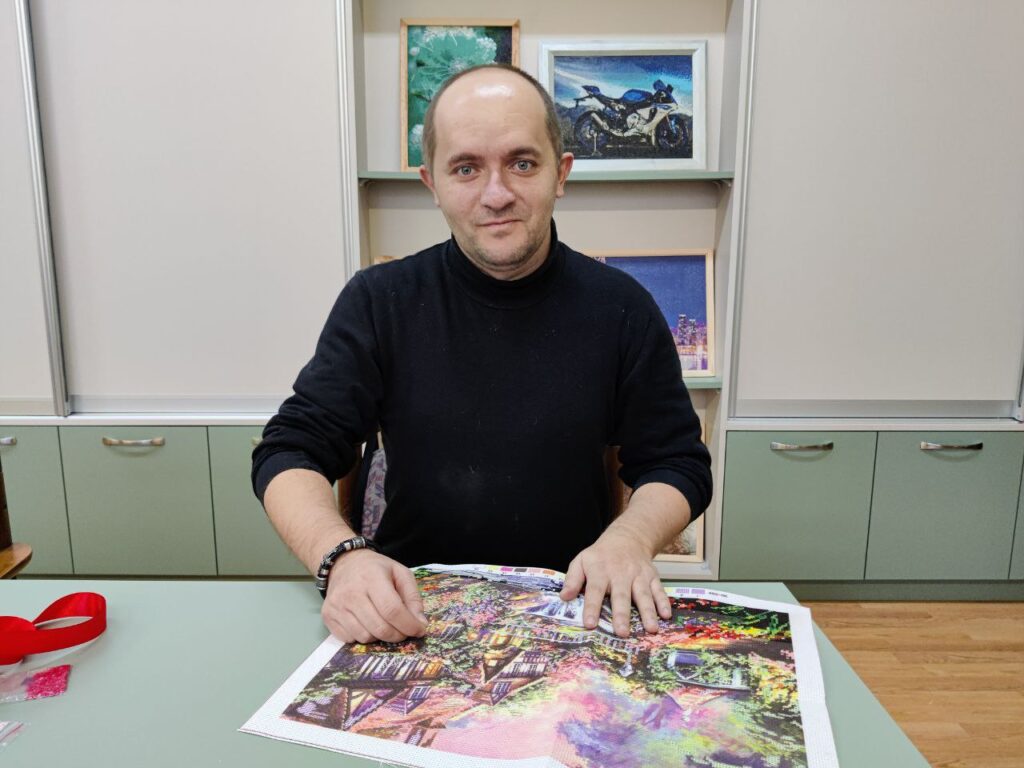 Технику вышивания инвалид второй группы Кирилл Малов освоил еще в юности, но более усердно стал вышивать в школе-интернате, а продолжил в Территориальном центре. Здесь он и достиг определенного профессионализма и создает картины в разных техниках: вышивка крестом на канве, алмазная мозаика и даже ковровая вышивка.