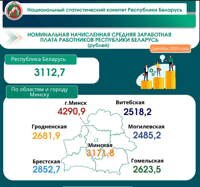 Номинальная начисленная средняя заработная плата работников Республики Беларусь в декабре 2025 года составила Br3112,7. Об этом сообщили в Национальном статистическом комитете.