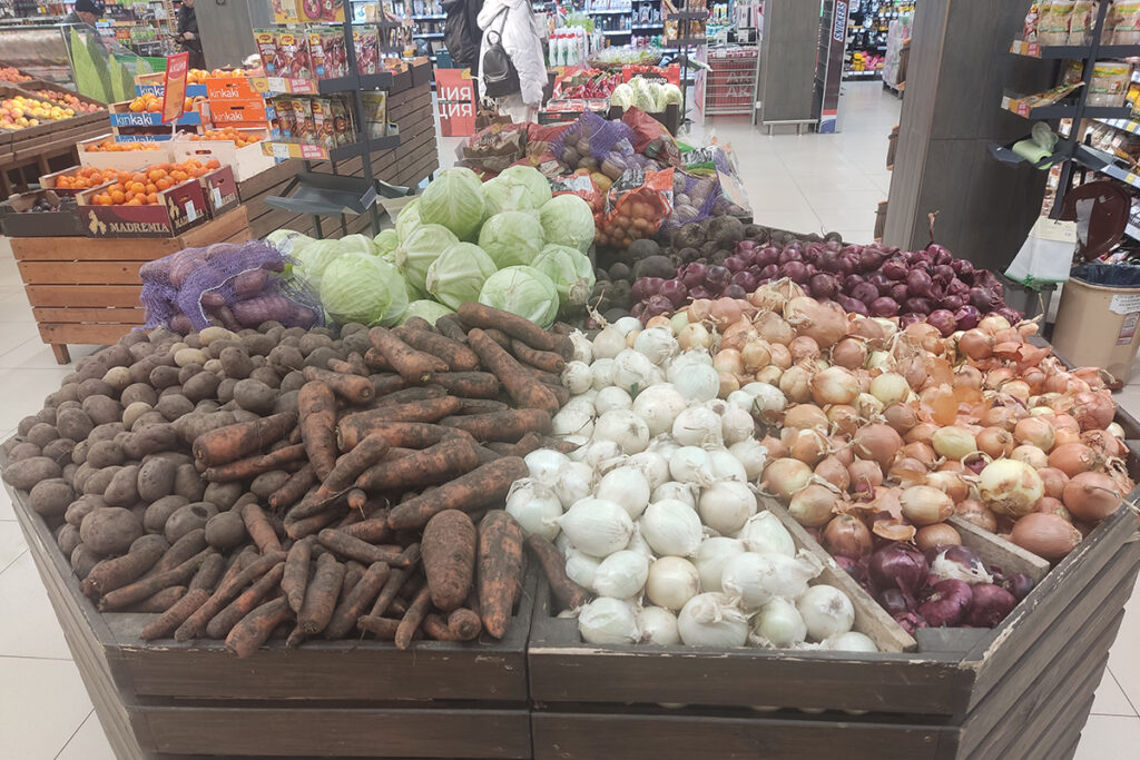 Как обстоят дела с ценами в Жодино? Для начала отправляюсь на овощной шопинг в гипермаркеты. Здесь килограмм белокочанной капусты обойдется в 1,12 рубля, моркови от 1,28 до 1,35, обычной свеклы – от 1,09 до 1,17, цилиндрической – от 1,09 до 1,12, лука репчатого белого – от 1,65 до 1,75, красный дороже: от 2,05 до 3,54, картофель – от 1 рубля. На «красной цене» любимый овощ белорусов можно купить за 89 копеек.