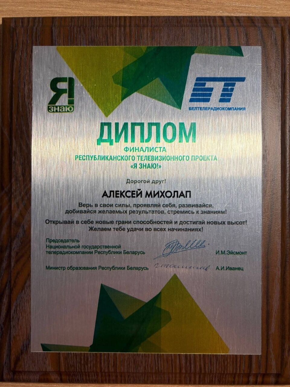 На Республиканском телевизионном проекте «Я знаю!» учащийся 9Б класса СШ №8 Алексей Михолап показал отличный результат и получил Диплом финалиста!