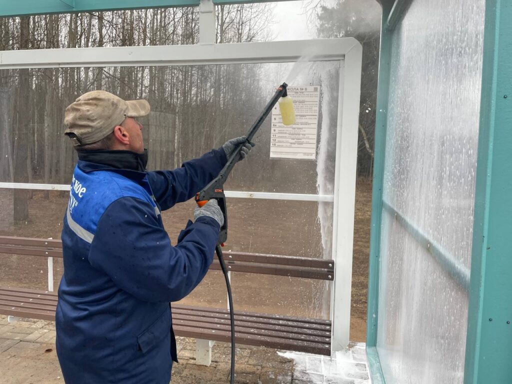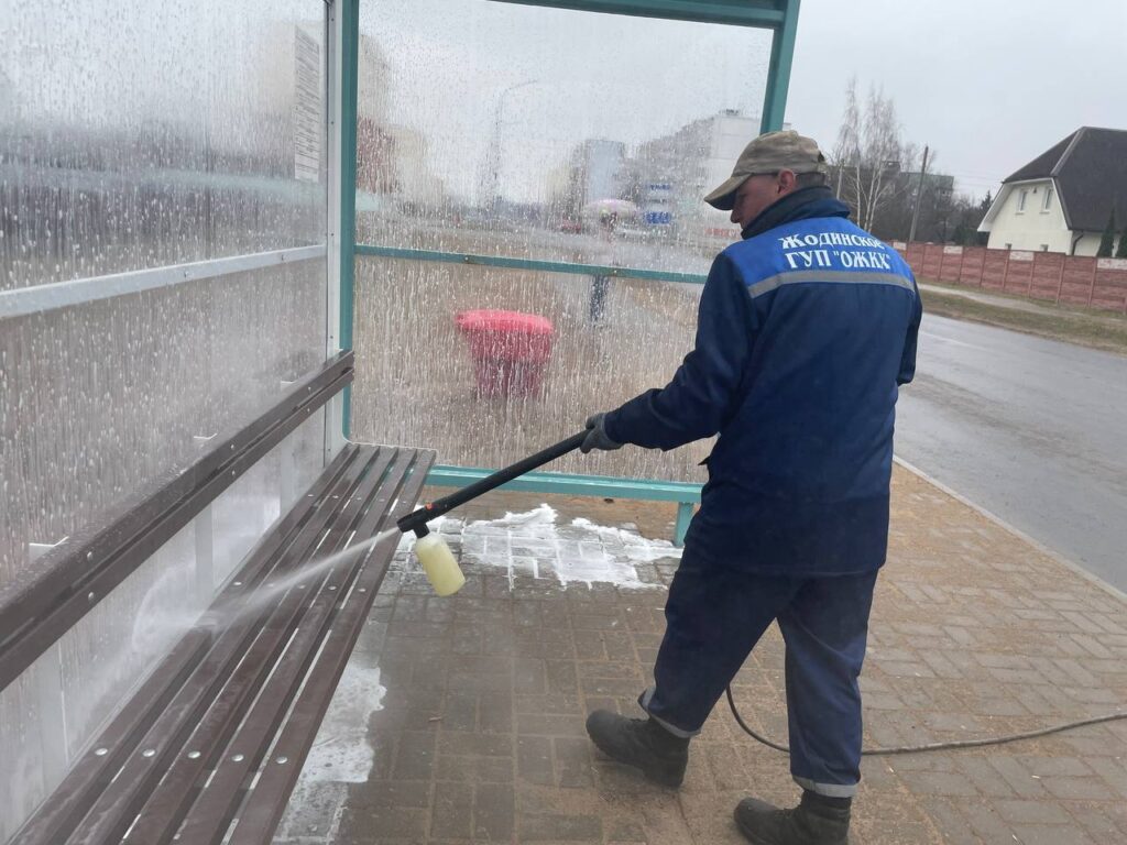 При помощи спецоборудования и моющих средств рабочие моют остановки, удаляя грязь, пыль и объявления. Сегодня работы идут на пр. Венисье и ул. Калиновского, затем — на Р53.