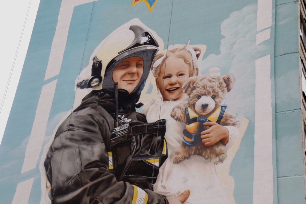 – Когда я начал работать над эскизом, перед глазами стояли реальные кадры: спасатель, выносящий ребёнка из опасности, и этот ребёнок – с мишкой, как с последним островком спокойствия. Я хотел, чтобы зритель почувствовал не просто силу, а тепло. Кстати, у МЧС Республики Беларусь есть бренд-пакет «У стихии нет сердца» и мишка из него – это контраст. Стихия разрушает, а человек спасает. Это граффити – мой способ сказать: у МЧС есть сердце, и оно бьётся ради тех, кто нуждается в защите, – поделился художник, автор работы Константин Пахомчик.