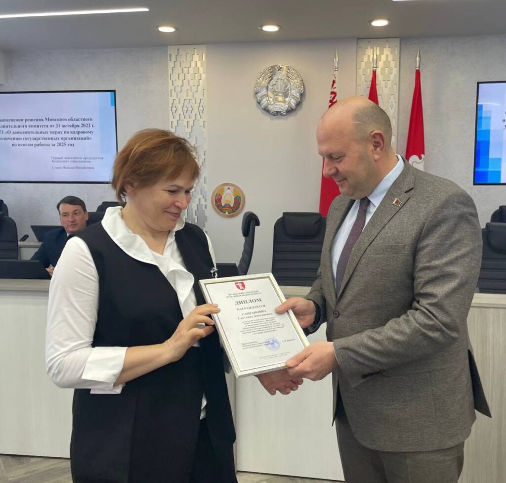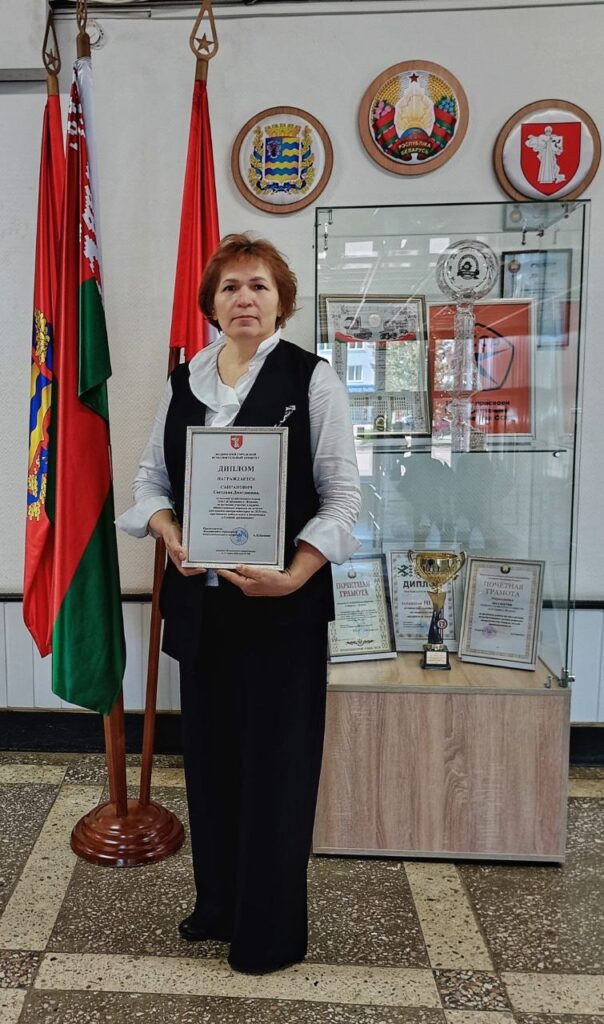 Светлана трудится на фабрике около 40 лет: окончила Минский государственный политехнический институт, где получила специальность инженера-механика, сейчас она начальник хозяйственного отдела. В дружине состоит с 2014 года и за это время получила не одну благодарность за активное участие в охране общественного порядка, трижды побеждала в номинации «Лучший дружинник» – в 2021, 2022 и в 2025 годах. В этот раз диплом ей вручил председатель горисполкома Александр Цивако.