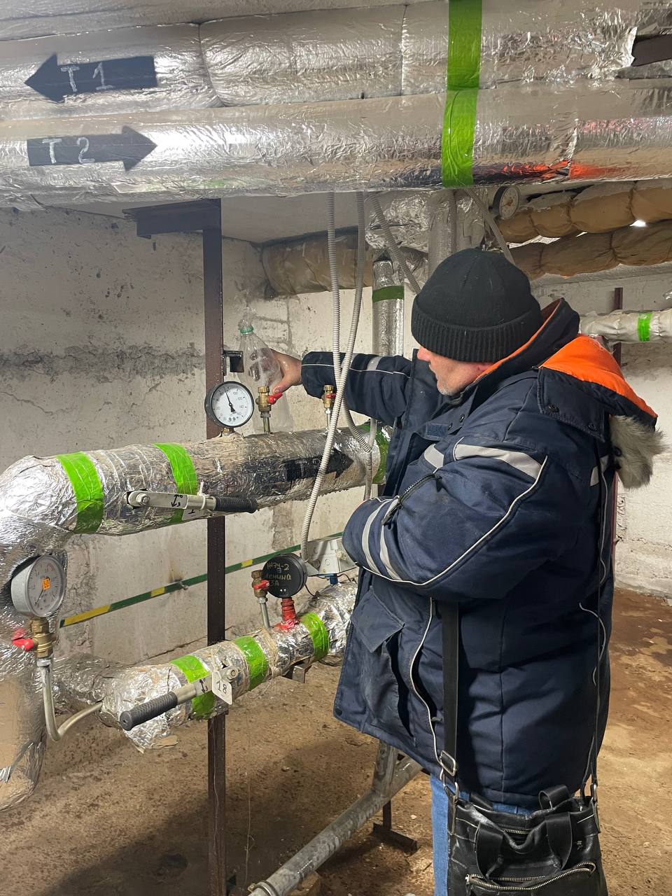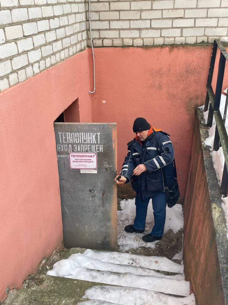 Далее отправляемся в тепловой узел дома №13а на пр. Ленина. Взять пробу горячей воды нам помогает начальник ЖЭУ-2 Максим Ступаков. Он открывает кран, и вода бьет фонтаном. Она чистая.