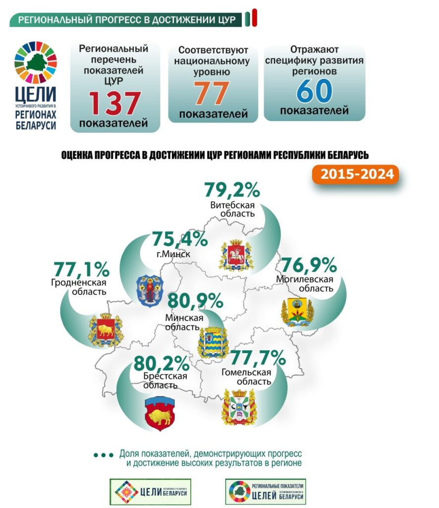 По итогам проведенной оценки прогресс достижения ЦУР Минской областью составил 80,9%, Брестской — 80,2%, Витебской — 79,2%, Гомельской — 77,7%, Гродненской — 77,1%, Могилевской — 76,9%, Минска — 75,4%.