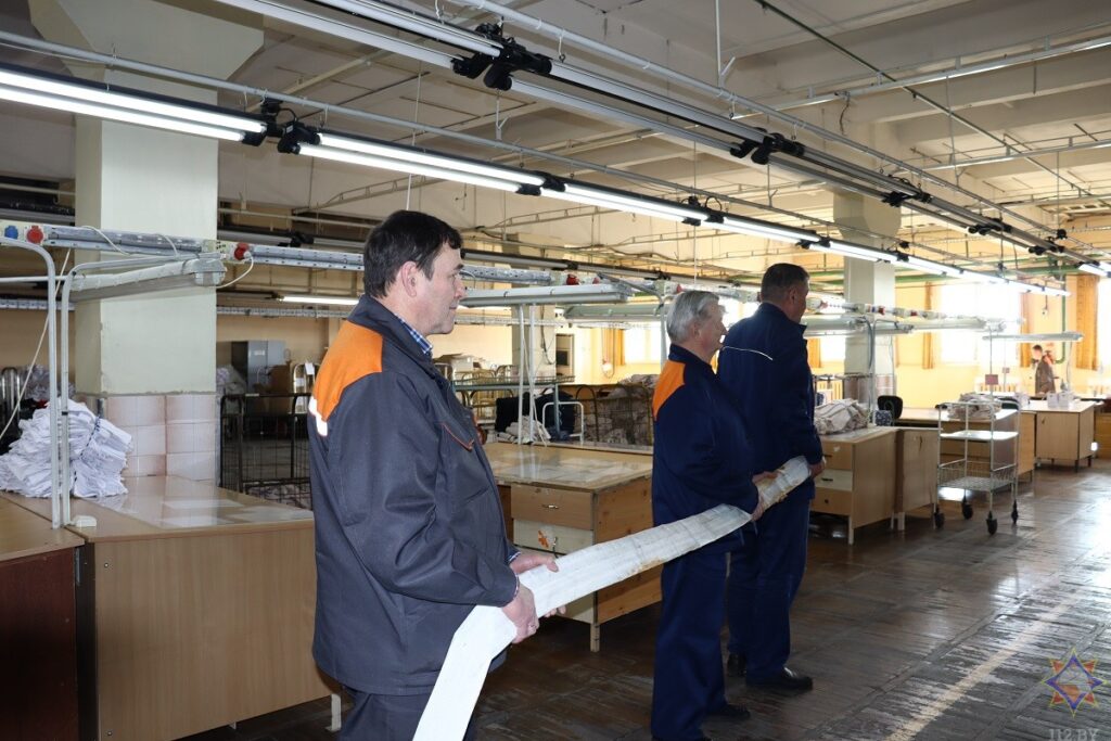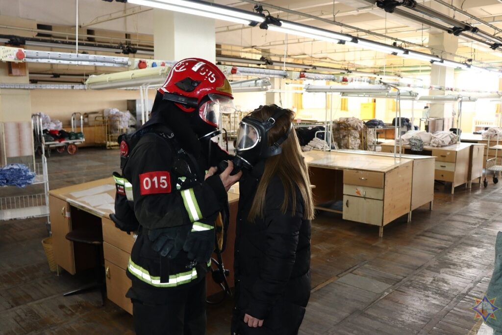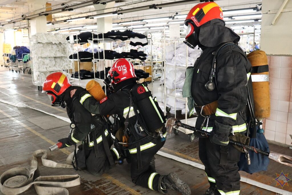В одном из цехов открытого акционерного общества «Свiтанак» прошли тактико-специальные учения спасателей. Под руководством начальника отдела Олега Пашука спасатели отработали действия по ликвидации условного пожара в швейном производстве на втором этаже здания.