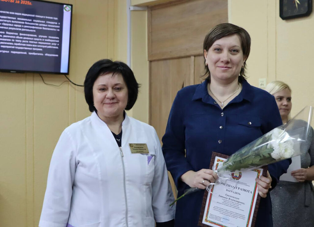 За добросовестный труд в системе здравоохранения Минской области и достигнутые высокие показатели в организации медицинского обслуживания по итогам работы за 2025 год Почетной грамотой главного управления по здравоохранению Минского облисполкома награждена медицинская сестра хирургического отделения Татьяна Гразновская.