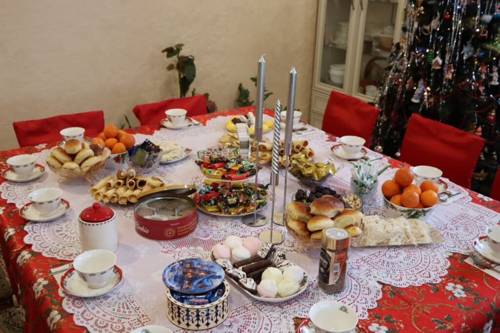 Дети и взрослые водили веселый хоровод вместе с Дедом Морозом и Снегурочкой и пили чай с выпечкой.