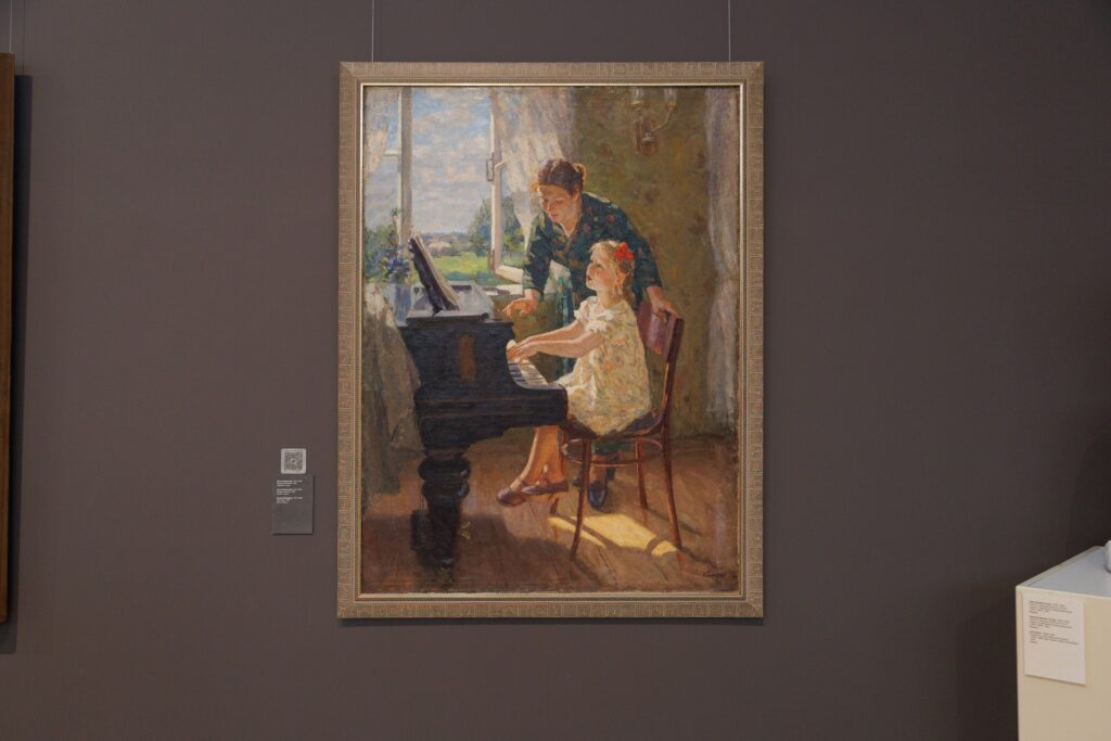 Картина Антона Бархаткова «Первая песенка», созданная в 1950-е годы и представленная в основной экспозиции музея, в анимированном формате покажет живую сцену из детства: маленькая девочка играет на рояле, болтает ногами и поет, ей вторит женщина рядом – учительница или мама (художник изобразил свою жену), а солнечный пейзаж за окном наполняется движением и светом.