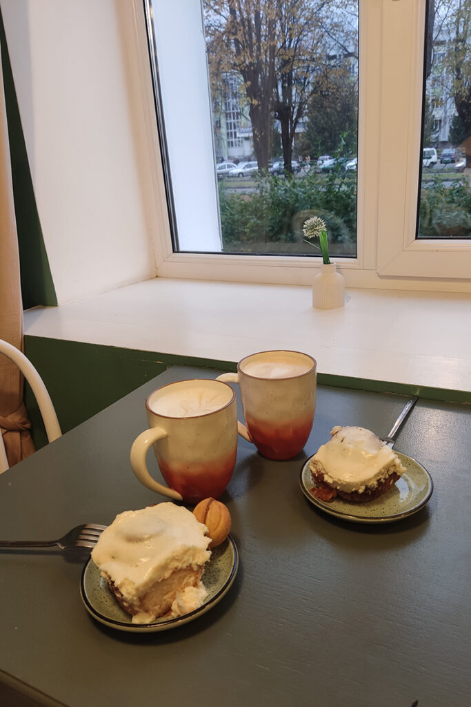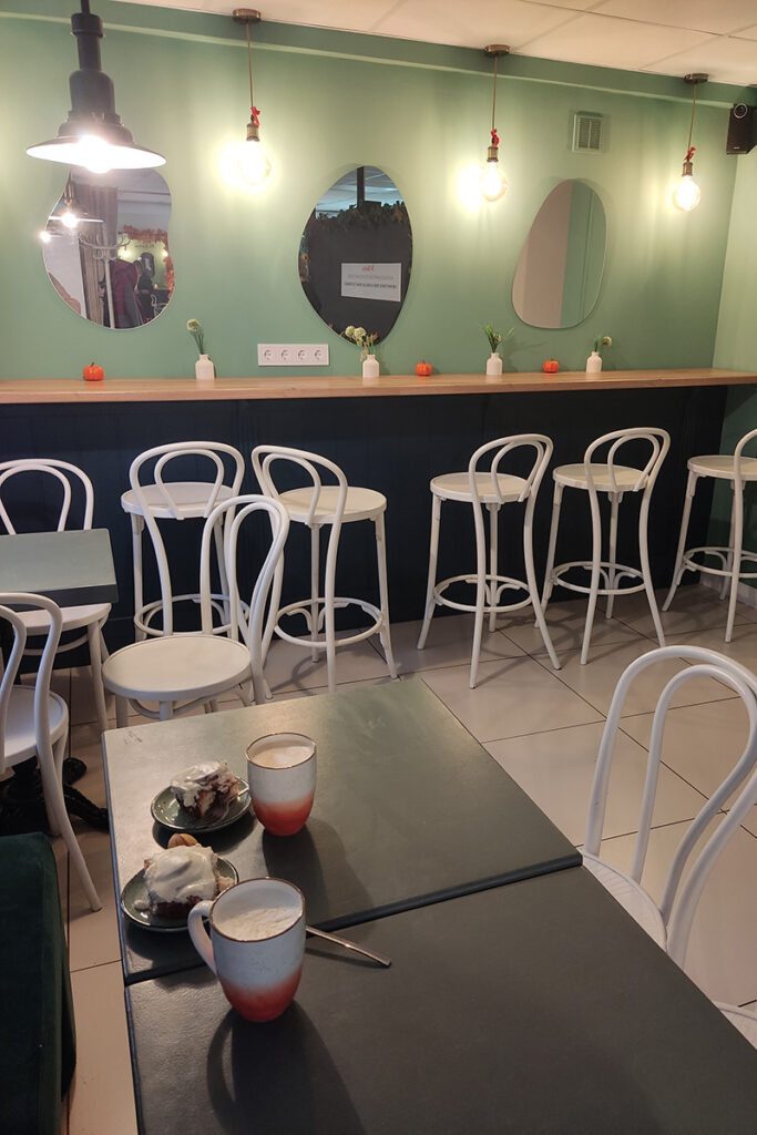 В небольшом уютном помещении можно выбрать место за столиком у окна или за барной стойкой. А пока готовится ваш кофе – сделать снимок на память в импровизированной фотозоне у зеркала с милой надписью «А кто тут такой красивый?». Подобный кадр у меня уже был, поэтому сразу направляюсь к кассе изучать ассортимент. Согреться в сырую осеннюю погоду можно не только разными вариациями кофе, посетителям предлагают чаи, матчу, какао, молочные коктейли и мороженое – для тех, кто не боится холодов. Мы выбрали большой капучино и латте.