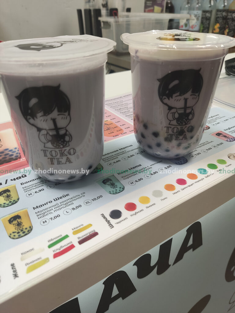 Для меня здесь всё в новинку, поэтому долго изучаю меню. В ассортименте лимонады на чае, фирменные коктейли, классический молочный чай – и каждого с десяток видов. А еще к ним предлагают различные топинги, шарики и даже сырную крышку. Признаюсь, от такого многообразия я растерялась. По рекомендации сына выбрала большой «Таро» – сливочный напиток со вкусом печенья. Шарики из тапиоки – в комплекте. Сын взял клубничный шейк.