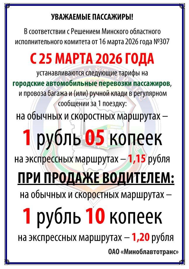 С 25 марта стоимость проезда в общественном транспорте подорожает на 10 копеек. Соответствующее решение Минского облисполкома от 16 марта 2026 года №307 официально опубликовано на Национальном правовом интернет-портале .
