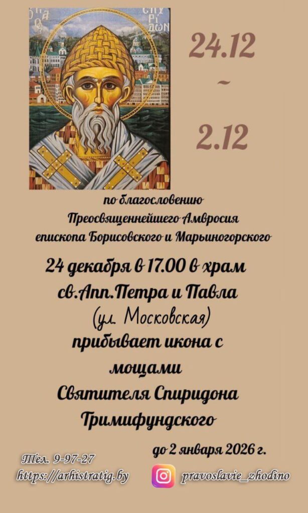 24 декабря в 17.00 по благословению Преосвященнейшего Амвросия епископа Борисовского и Марьиногорского в храм Святых апостолов Петра и Павла (улица Московская, 113) прибывает икона с мощами Святителя Спиридона Тримифундского.