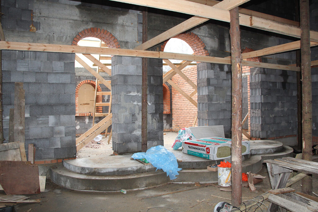 – Благодаря пожертвованиям прихожан, предприятий города, неравнодушных людей сделано очень многое: выведены стены под крышу, выполнена черновая стяжка пола и начаты работы по установке стропильной системы, – рассказывает настоятель. – Но впереди еще один важный этап – укладка кровли, изготовление и установка куполов. Их будет два: над храмом и колокольней. Они символизируют человеческое и божественное естество.