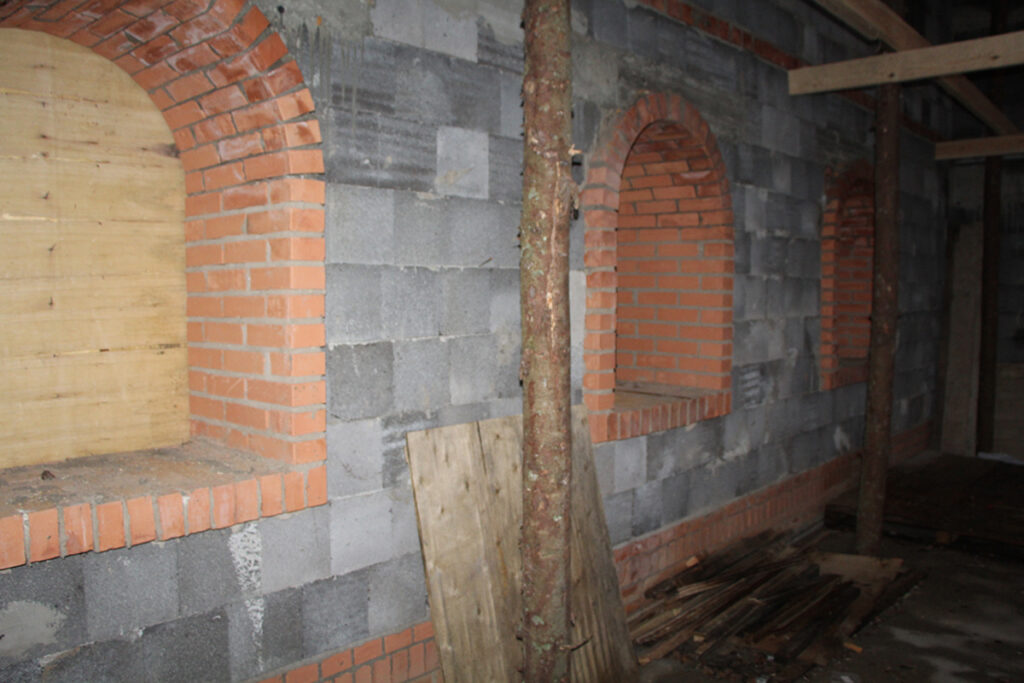 С приходом весны в приходе вновь закипели строительные работы – приступили к закладке стен. Сейчас они уже выведены под крышу, которая на разных участках будет двух-, трех- и четырехскатной, устанавливается стропильная система.