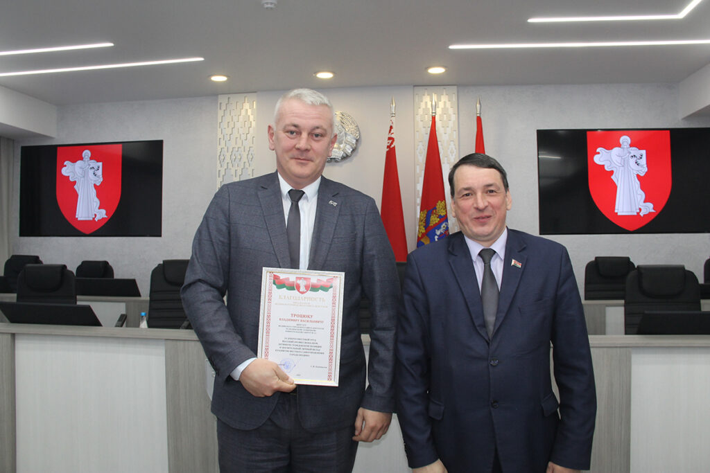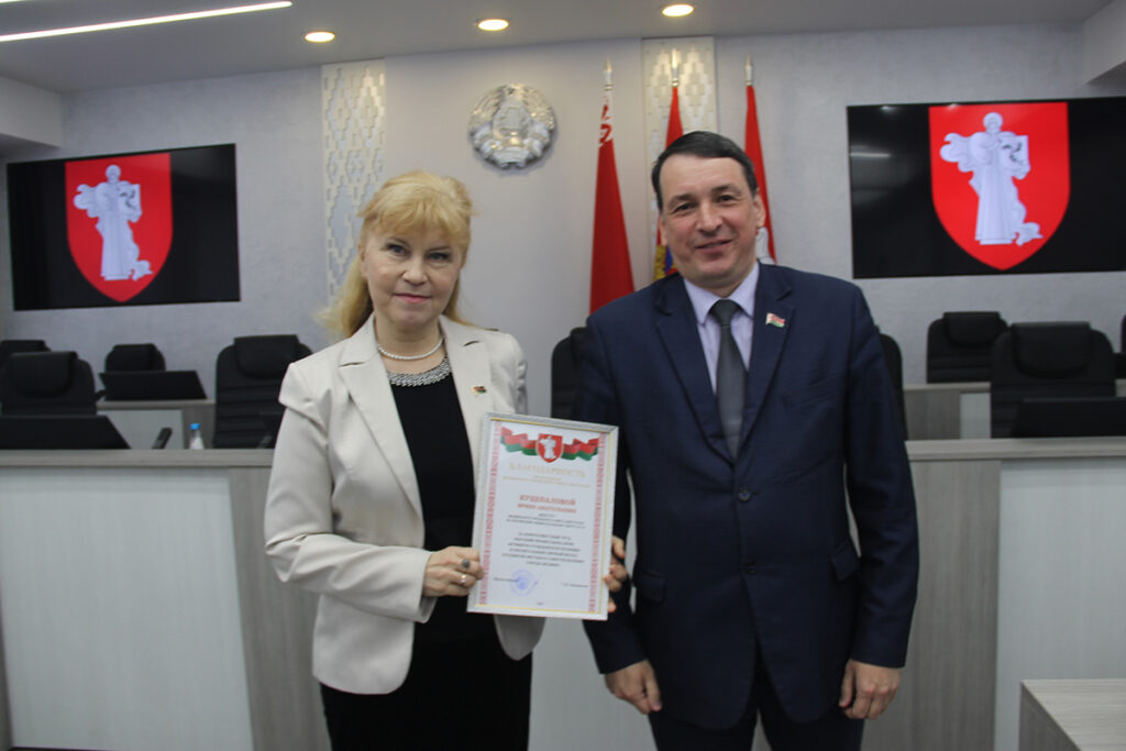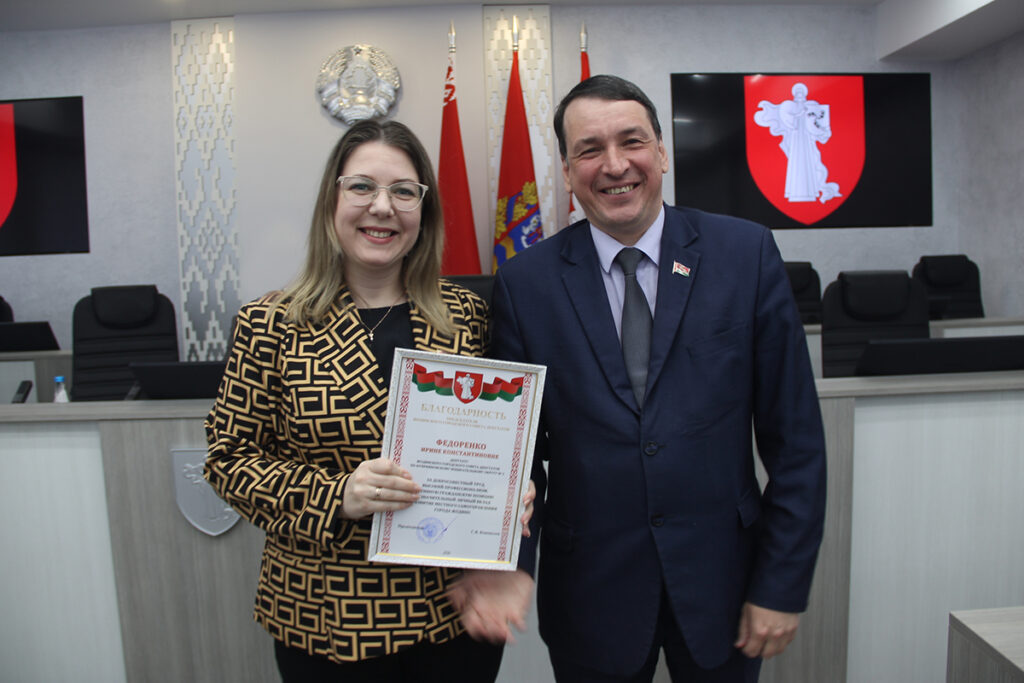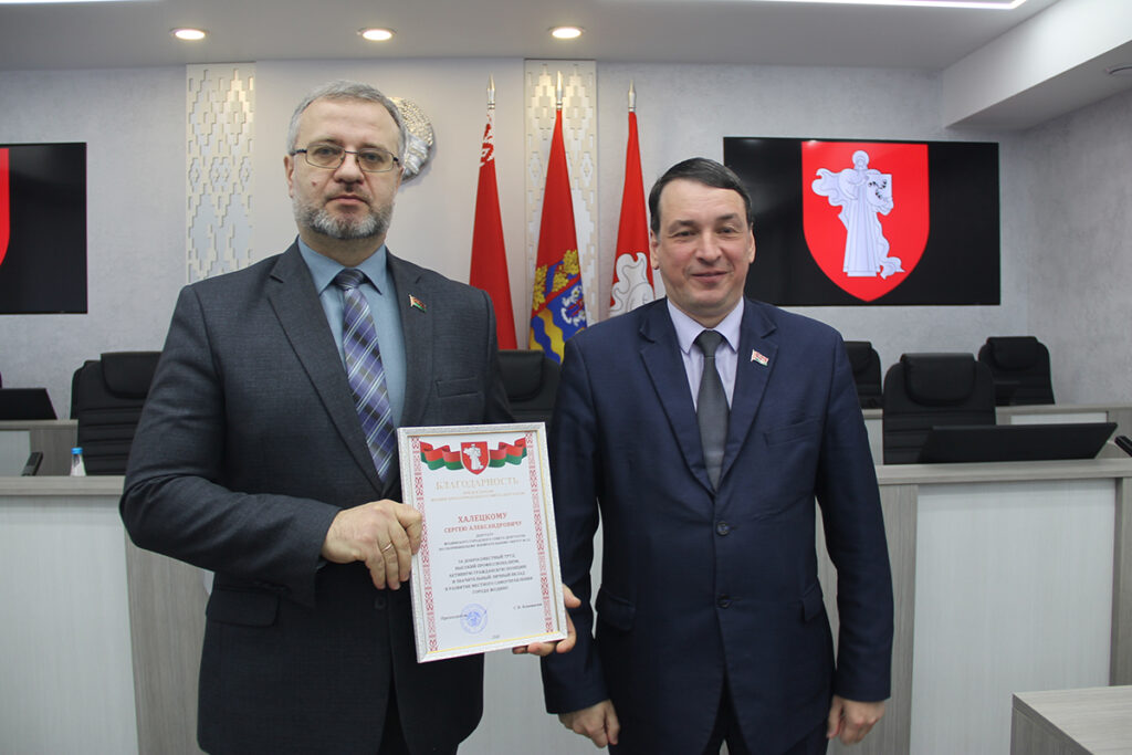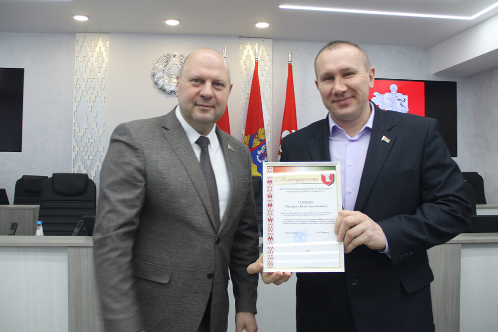 А Благодарности председателя Совета депутатов вручены Ирине Куцепаловой (Логойский избирательный округ№19), Владимиру Троцюку, (Жодинский солнечный избирательный округ №23), Сергею Тюльманкову (Советский армейский избирательный округ №9), Дмитрию Стребкову (Фрунзенский заречанский округ №6), Ирине Федоренко (Куприяновский избирательный округ №1), Сергею Халецкому (Скориниский избирательный округ №21), Дмитрию Яскевичу (Калиновский избирательный округ №17).