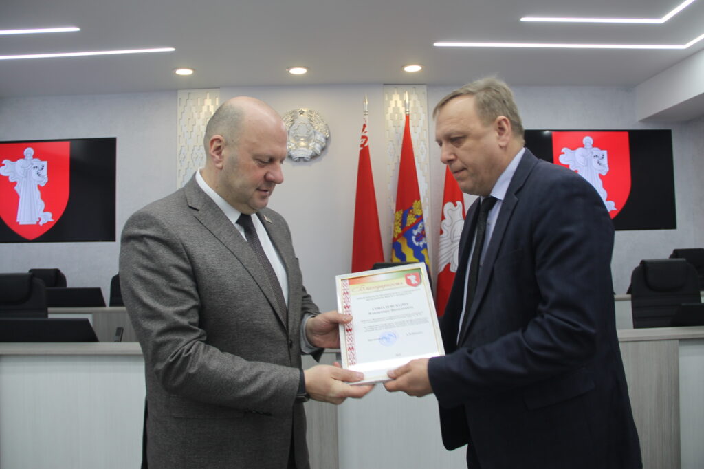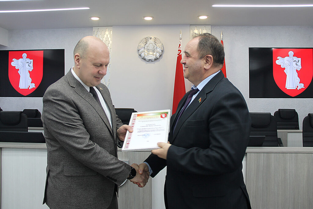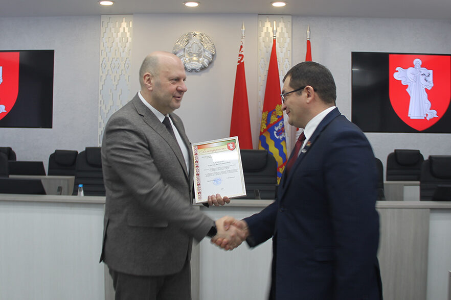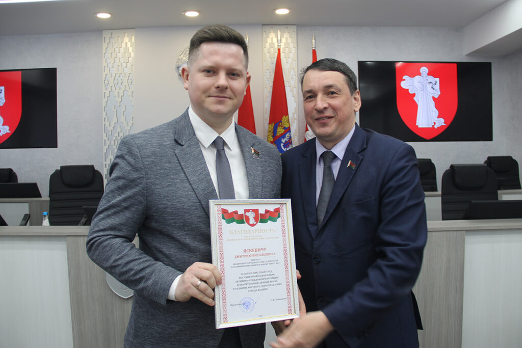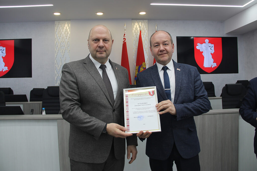 А Благодарности председателя Совета депутатов вручены Ирине Куцепаловой (Логойский избирательный округ№19), Владимиру Троцюку, (Жодинский солнечный избирательный округ №23), Сергею Тюльманкову (Советский армейский избирательный округ №9), Дмитрию Стребкову (Фрунзенский заречанский округ №6), Ирине Федоренко (Куприяновский избирательный округ №1), Сергею Халецкому (Скориниский избирательный округ №21), Дмитрию Яскевичу (Калиновский избирательный округ №17).