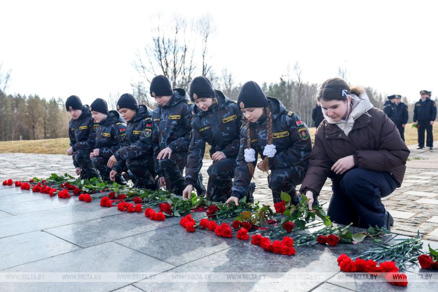 По традиции посетители мемориала возложили цветы к фигуре Непокоренного человека, к братской могиле, в которой упокоен прах сгоревших в огне жителей.