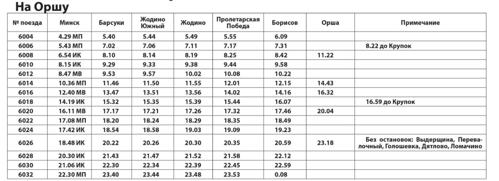 – в выходные и праздничные дни время отправления от о.п. «Богуслав Поле» 8.25, от о.п. «АС Жодино» 9.30, 15.50, 18.55, от о.п. «С/т «Строитель» 9.00, 10.00, 16.20 (19.25 до о.п. «Богуслав Поле).