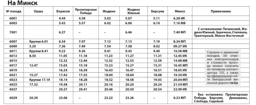 Справки о движении поездов, отменах электропоездов, стоимости проезда можно получить по телефону контакт-центра 105, а также на официальном сайте Белорусской железной дороги – rw.by