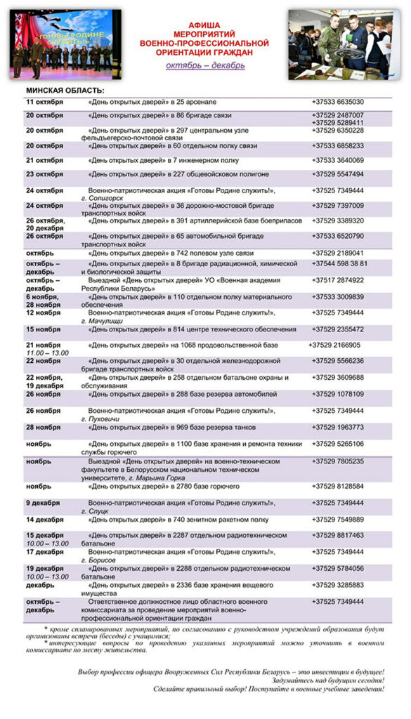 октябрь – декабрь Ответственное должностное лицо областного военного комиссариата за проведение мероприятий военно-профессиональной ориентации граждан (тел. +37525 7349444).
