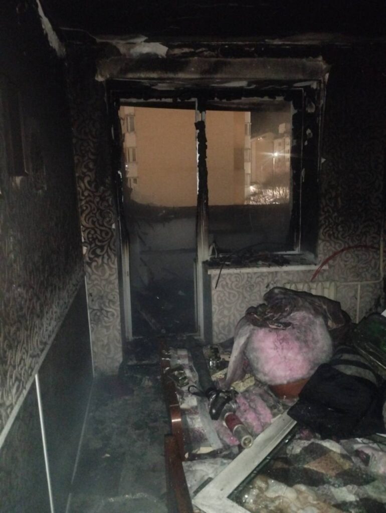 В результате пожара выгорел балкон одной из квартир. Огнем повреждена балконная рама, а также закопчены стены в прилегающей комнате.