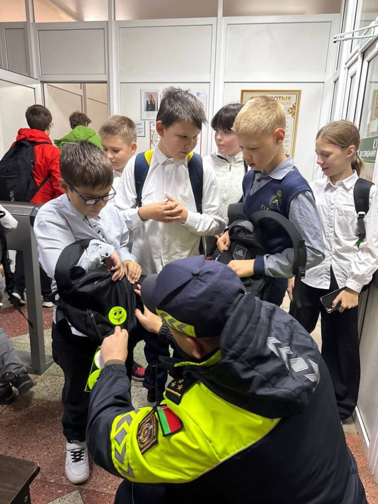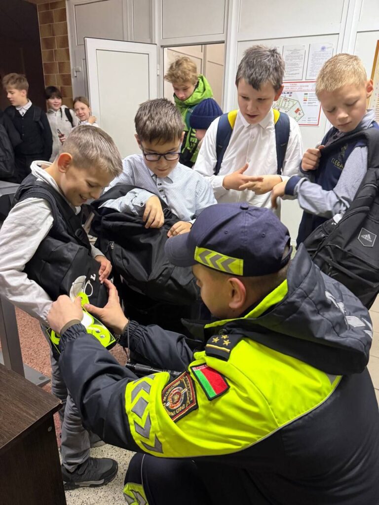 Перед началом занятий стражи дорог напомнили школьникам об основных правилах при переходе проезжей части и безопасном поведении на улице, а также обратили внимание детей на использование световозвращающих элементов в темное время суток.