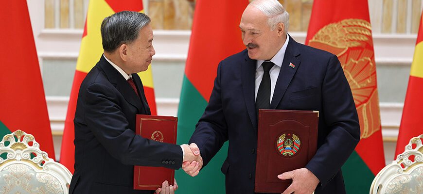 Лидеры Беларуси и Вьетнама Александр Лукашенко и То Лам по завершении переговоров в Минске приняли совместное заявление об установлении стратегического