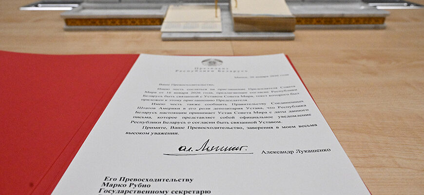 Президент Александр Лукашенко от имени Республики Беларусь подписал документ о присоединении Беларуси к Совету мира и выполнении положений Устава Совета мира.