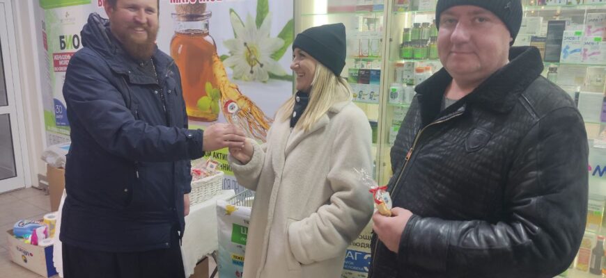 Волонтёры — воспитанники воскресной не_школы прихода храма преподобного Сергия Радонежского и ученицы женской гимназии раздают флаеры с условиями акции.