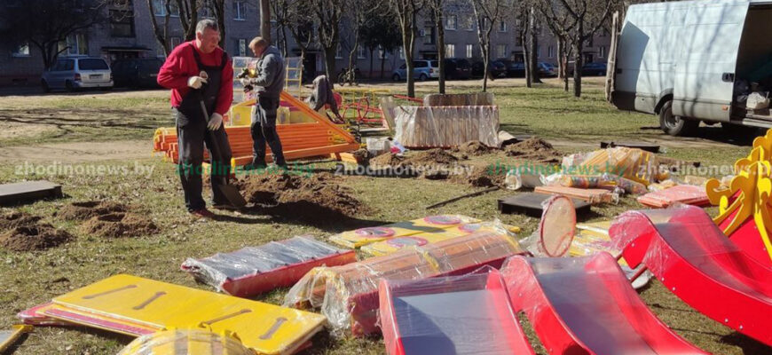 Во дворе домов №4 на улице 50 лет Октября и №22 на проспекте Мира устанавливают детскую площадку. Совсем скоро игровой городок испробует детвора из соседних домов.