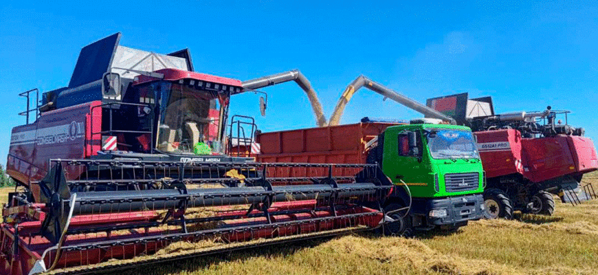 На зерноуборочные работы в поля вышли 6 комбайнов и три самосвала «МАЗ». Комбайнеры уже убрали 245 гектаров из 325, намолотив 736 тонн зерна.