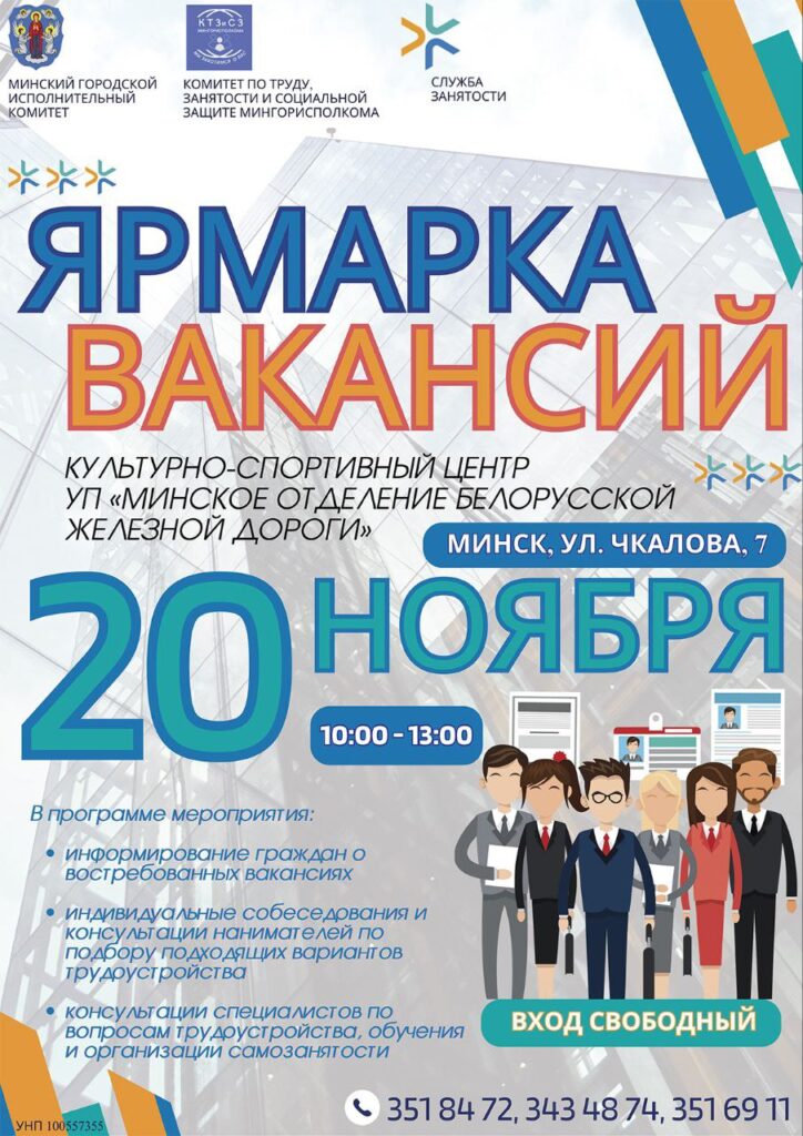 20 ноября с 10.00 до 13.00 в культурно-спортивном центре «Минского отделения БЖД» (Минск, улица Чкалова, 7) пройдет ярмарка вакансий.