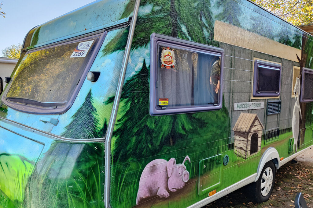 Среди многочисленных кемперов выделялся яркий прицеп-дача, разукрашенный в стиле мультфильма «Маша и Медведь», россиянина Андрея Ткачева. Автотурист со стажем рассказал, что начинал с соревнований в офф-роуде на внедорожнике. Почти на всех соревнованиях Андрея сопровождала жена, и ей категорически не нравилось жить в палатке или «УАЗике». Так пришла идея купить кемпер.